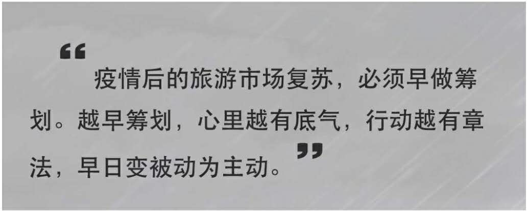 葛磊:在市場自然增長的時候,營銷的作用是順水推舟;在市場遭遇困境的時候,營銷的作用是逆水行舟,更需體現(xiàn)擔當與價值。當前,誰也不知道疫情結束的時間點,但對于疫情后的旅游市場復蘇,必須早做籌劃。越早籌劃,心里越有底氣,行動越有章法,早日變被動為主動。
